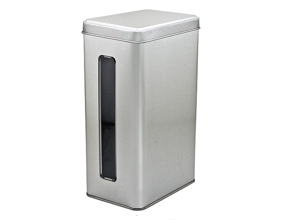 Teedose, silberfarbig für ca. 400g Schwarzer Tee, aus Metall mit Fenster. Größe: 118 mm x 73 mm  x 180 mm hoch, mit Stülpdeckel.