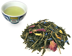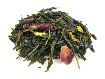 erfrischender Sencha-Grüntee mit fruchtigem Geschmack, Zutaten: grüner Tee, Aroma, Sonnenblumenblütenblätter, natürliches Aroma, Rosenblütenblätter rot, Kornblumenblütenblätter blau.