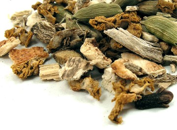 Zutaten: Thymian, Zimt, Fenchel, Süßholzwurzel 1), Orangenschalen, Eibischwurzel, Cardamom, Kurkumawurzel, Pfeffer, Nelken, Wollblumenblüten