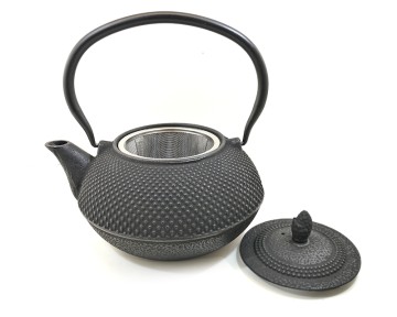 Eine gusseiserne Teekanne in klassischer Nagelkopfstruktur, innen emailliert, mit Edelstahlsieb für bis 1,2 Liter. Maße: ca. 16,2 cm x 19 cm x 20 cm hoch.