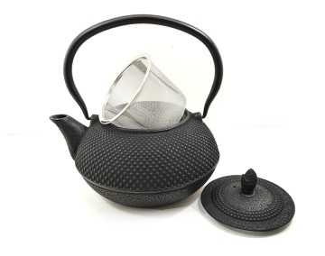 Eine gusseiserne Teekanne in klassischer Nagelkopfstruktur, innen emailliert mit herausnehmbaren Edelstahlsieb. Als Teekanne oder Wasserkessel.