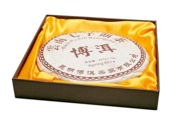 Ein Pu-Erh aus schwarzem Tee von wildwachsenden Teebäumen in Teekuchen-Form. Der Tee aus dem Jahr 2014 kommt aus den Bergen von Si Mao.