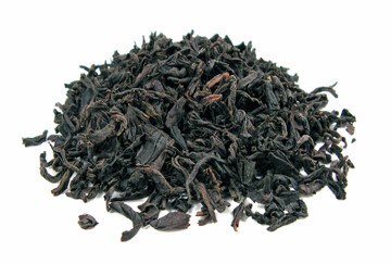 geräucherter Tee aus der Provinz Fujian im Südosten von China, großes Blatt, dunklere Tasse mit delikatem Rauchgeschmack.